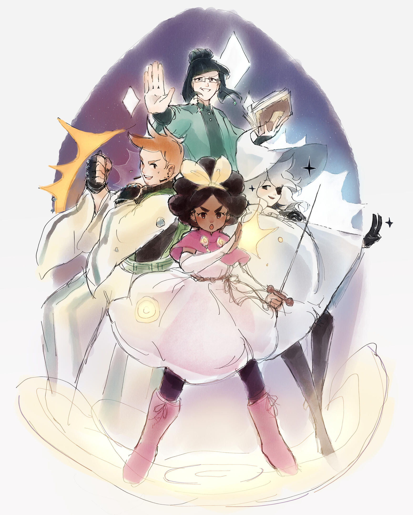 • Sketchbook Page - sketched with pen or pencil on a sketchbook pageA page will contain at least one fullbody sketch, though other sketches on the page will vary. You may specify your preferences, but otherwise, sketches and coloring style will all be done at my own discretion.Additional characters may be included on a sketch page. The added cost will be based on how much you want the characters to be included (e.g. doodle in the corner vs. fullbody sketches).